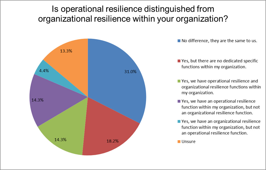 Perhaps the two disciplines that come closest to organizational resilience are operational resilience and enterprise risk management (ERM). Indeed, the BCI Operational Resilience Report 2023, which was published during BCAW 2023, found that many organizations use concepts and tools related to operational resilience and organizational resilience interchangeably; and 31 percent of respondents to a survey for the report stated that their organization does not distinguish between the two disciplines at all. See the figure, below, taken from the report: